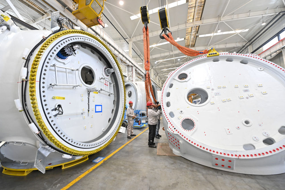 2025年9月24日,工人在位于山西轉(zhuǎn)型綜合改革示范區(qū)的太重集團新能源產(chǎn)業(yè)園區(qū)吊運風電裝備。新華社記者 楊晨光 攝