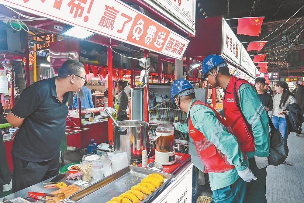 “附近商戶多,用電量大。風(fēng)機(jī)箱和變壓器是檢查重點(diǎn),測溫不能出錯(cuò)。”10月2日,山西太原供電公司青年突擊隊(duì)隊(duì)長毛輕揚(yáng)在迎澤區(qū)鐘樓街開展用電檢查時(shí),向隊(duì)員們強(qiáng)調(diào)注意事項(xiàng)。該公司團(tuán)委組織青年突擊隊(duì)聯(lián)合黨員服務(wù)隊(duì)嚴(yán)密監(jiān)控景區(qū)、商業(yè)區(qū)等人員密集區(qū)域用電情況,及時(shí)發(fā)現(xiàn)并處置用電隱患。